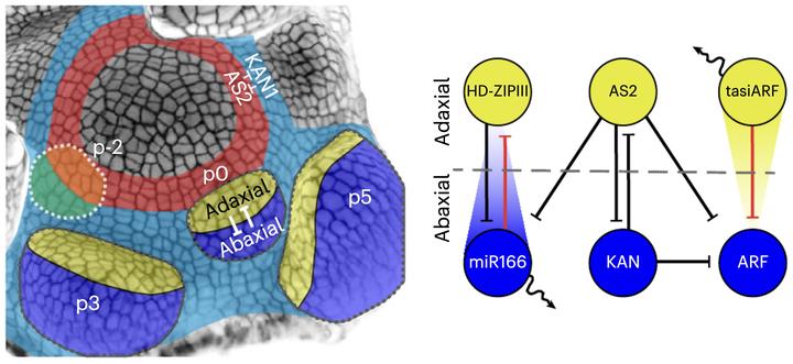 The formation of a flat and thin leaf presents a developmentally challenging problem, requiring intricate regulation of adaxial–abaxial (top–bottom) polarity. The patterning principles controlling the spatial arrangement of these domains during organ growth have remained unclear. Here we show that this regulation in Arabidopsis thaliana is achieved by an organ-autonomous Turing reaction‐diffusion system centred on mobile small RNAs. The data illustrate how Turing dynamics transiently instructed by prepatterned information is sufficient to self‐sustain properly oriented polarity in a dynamic, growing organ, presenting intriguing parallels to left–right patterning in the vertebrate embryo. Computational modelling demonstrates that this self-organizing system continuously adapts to coordinate the robust planar polarity of a flat leaf while affording flexibility to generate the tissue patterns of evolutionarily diverse organ shapes. Our findings identify a small-RNA-based Turing network as a dynamic regulator of organ polarity that accounts for leaf shape diversity at the level of the individual organ, plant or species.